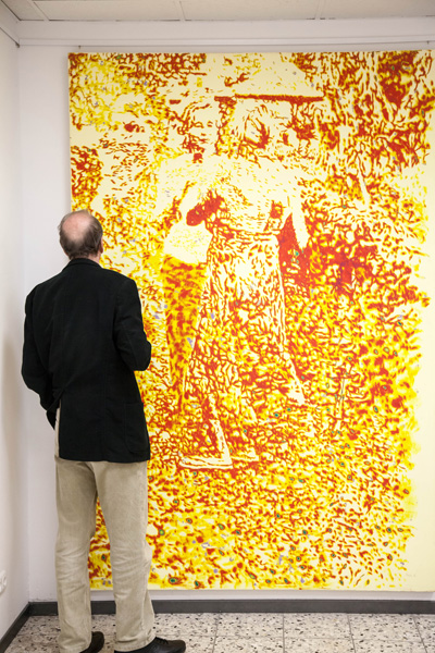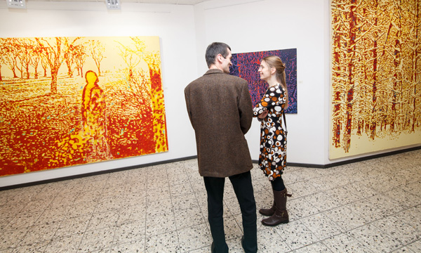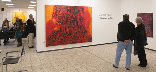 ...Vor allem sind es die Stämme, die Günter Paule zeigt. Die Rinde entsteht aus einem Spiel der Farben, aus kleinen Flecken, die das reale Vorbild in grafisch anmutende Abstraktionen auflösen. Wer nah herangeht, sieht Bearbeitungsspuren. Günter Paule malt mit dem Winkelschleifer. Bis zu 40 Farbschichten legt er übereinander, um dann in Schutzkleidung, vemummt fast wie ein Krieger, mit der Schleifscheibe zu den verborgenen Schichten vorzudringen, um die Farben ans Licht und damit Konturen und Flächen ins Bild zu bringen. Paules Bäume stehen da und scheinen doch zu schweben und von innen zu leuchten. Sie lösen sich aus der Farbe des Hintergrunds, der in Wahrheit ein Vordergrund ist. Ein Hauch von Mystik liegt darüber: Baumerscheinungen.