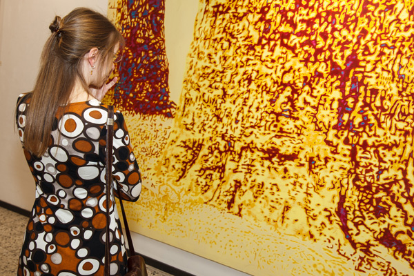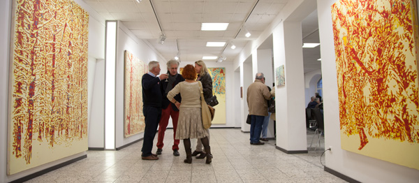 Hier sieht man den Wald vor lauter Bäumen, spürt ihn, hört ihn. Wie verzaubert steht er da und der Betrachter mittendrin, umringt von ehrwürdigen Baumriesen, wie im Irrealis gewachsen. Ein Kunst-Hain in Gelb, Orange und Rot, ein lichter Hain aus lauter Bildern, gemalten und radierten...